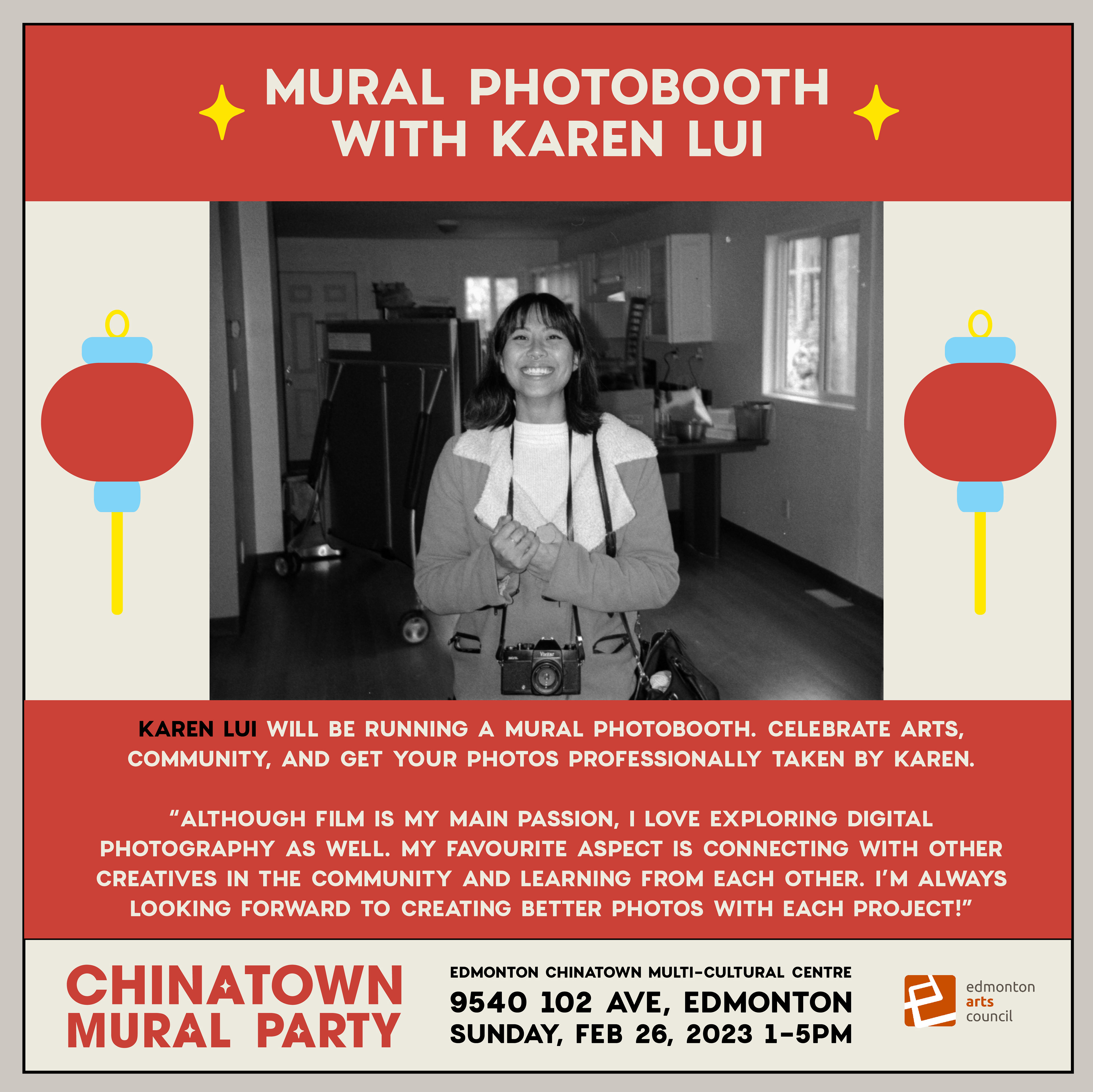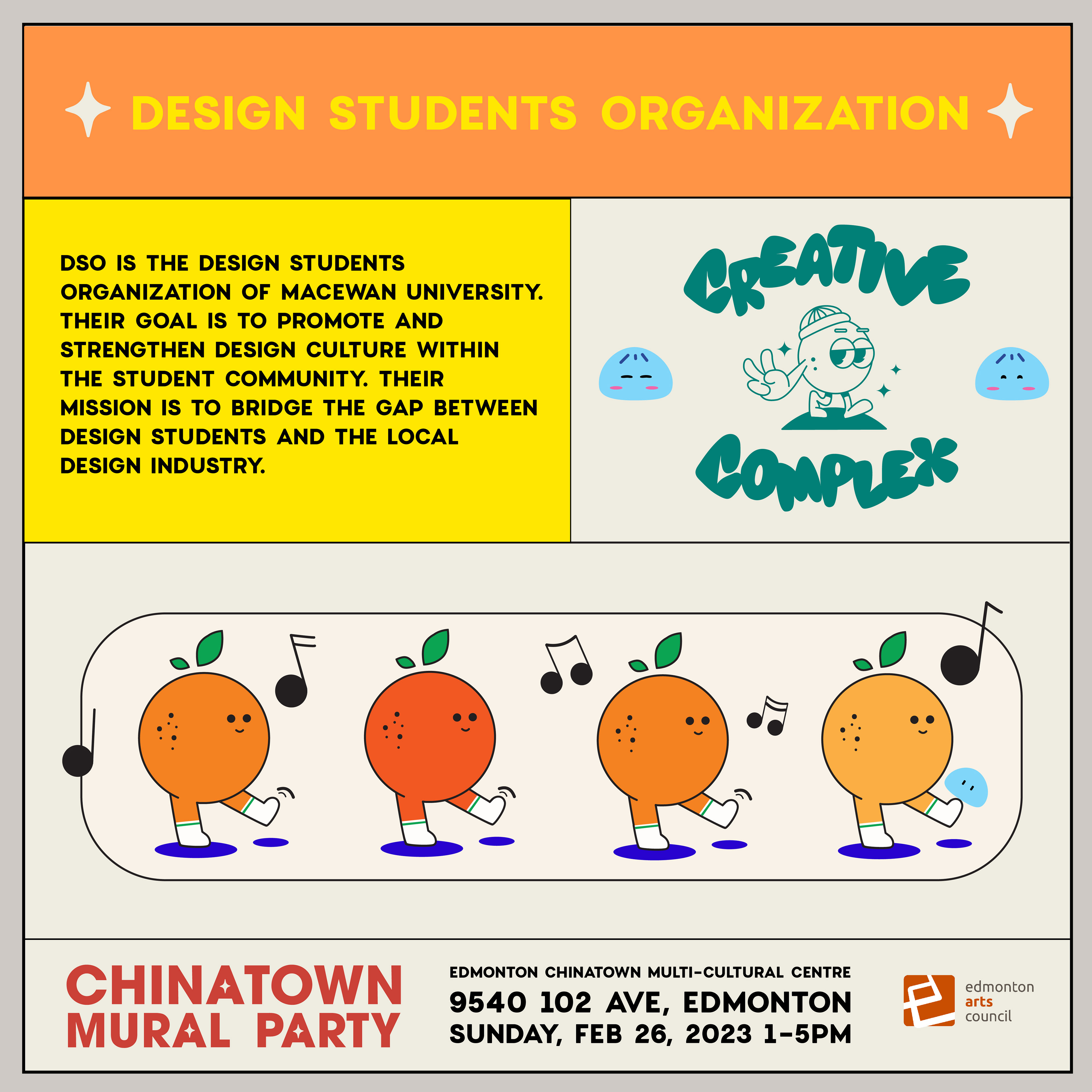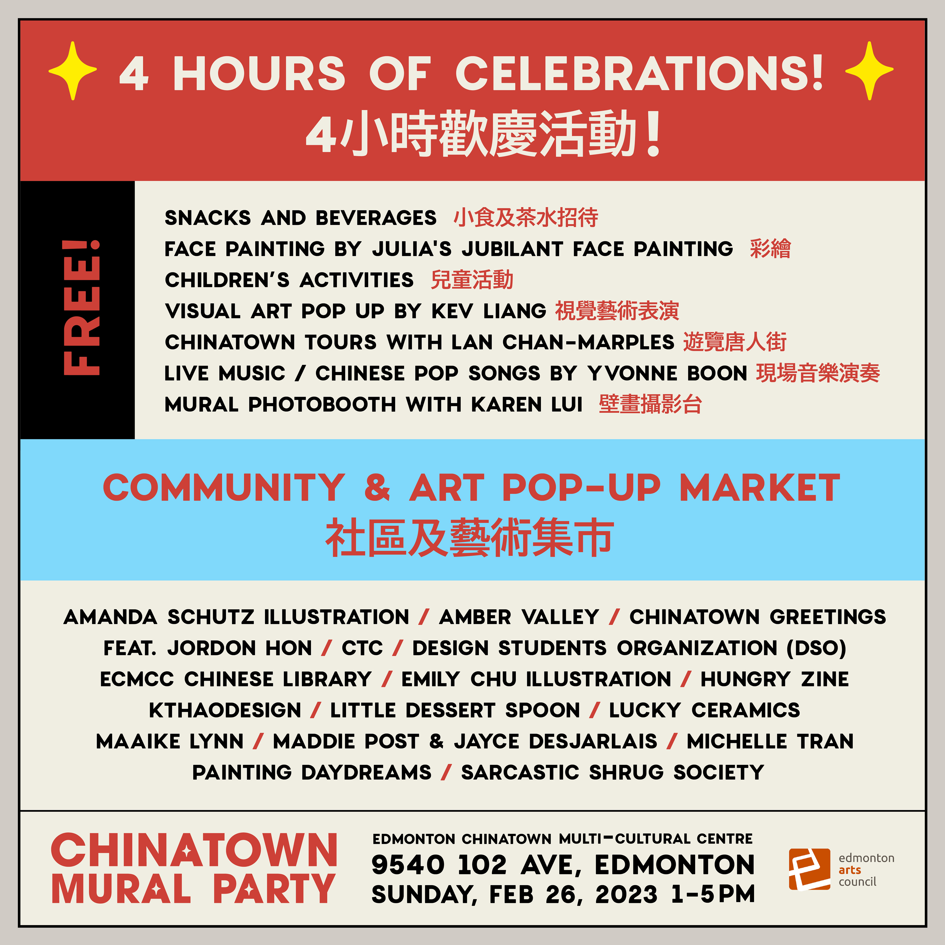 Working under the mentorship of Edmonton Chinese Illustrator, Emily Chu, I designed a set of social media posts advertising the Chinatown Mural Party hosted in the Edmonton Chinatown Multi-Cultural Centre by Togather Chinatown. These post successfully brought engagement from vendors and attendees leading up to the event.